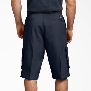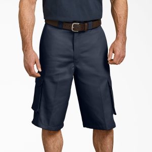 When the heat is on at work. keep it loose with our spacious. flexible Men’s Loose Fit Cargo Work Shorts. 13. The knee-length cut provides stylish longer coverage and optimum comfort. The FLEX fabric helps you stay sharp with a wrinkle-resistant design with an easy-care stain release finish that is easy to care for. Bellowed cargo pockets allow for generous storage. The ample fit is roomy in the seat and thigh. It is easy to wear a heavy tool belt with our signature tunnel belt loops.