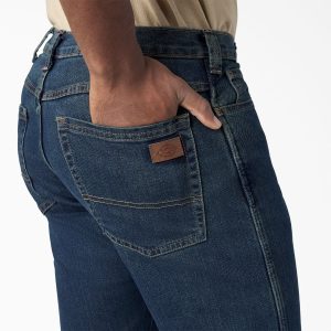 Our Men’s FLEX Regular Fit 5-Pocket Jeans are comfortable enough for a tough workday. yet stylish enough to wear any day. Featuring Dickies FLEX. this denim stretches to keep up with every move you make while offering durability you can trust and count on. It’s also constructed with double-needle stitching. and provides a regular fit with a straight leg style. The 5 pockets can help you move through your day with your hands free. And the antique brass button fastener adds a touch of flair.