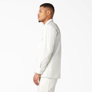 The Dickies Men’s Long Sleeve Work Shirt is one of our classic designs. providing both comfort and style. Made to last. this dependable work shirt. made of durable fabric. has a functional build and non-break melamine buttons. This iconic design features a generous cut through the shoulders and chest that provides freedom of movement. Advanced moisture-wicking technology and an easy-care stain release finish makes this work shirt perfect for both the workplace and for fun after work. The shirt also has two functional chest pockets. including one with a pencil division. doghouse sleeve plackets. and a woven Dickies logo label.