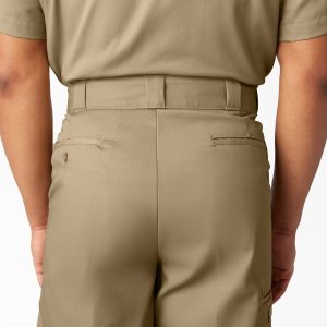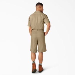 Work with a classic when you choose one of our bestsellers. Dickies Men’s Loose Fit Flat Front Work Shorts. 13. Popular for a reason. these shorts combine functionality with design. They offer a longer 13 inseam and spacious fit in the seat and thigh. The wrinkle-resistant. easy-care stain release finish to protect against wear and tear from tough jobs. Signature long tunnel belt loops have got your heavy-duty tool belts covered. Back welt pockets offer flap-free access. A multi-use pocket on the right leg provides additional storage. Stay looking sharp on the job with the flat front permanent crease.