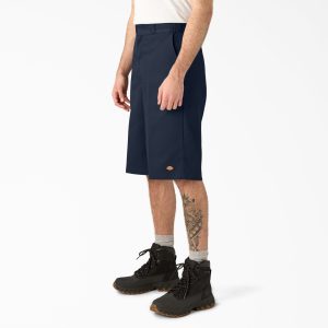 For more spacious coverage from your work shorts. the Men’s Loose Fit Multi-Use Pocket Work Shorts. 15 have got you covered. Featuring a longer fit 15 inseam. these shorts hit comfortably below the knees. The loose fit is designed with comfort in mind. including a two-piece waistband to prevent rolling for all-day ease of wear. Built to last. these shorts are wrinkle-resistant. with an easy-care stain release finish. Signature tunnel belt loops equip you for holding up heavy tool belts. A multi-use side pocket and left back pocket with secure matching button offer ample extra storage.