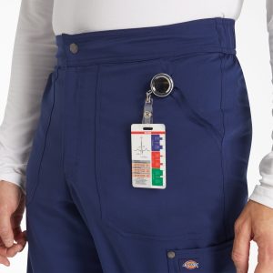 This Men’s fit mid rise pant has an elastic-reinforced waistband with inside logo drawstring for adjustability and security. Pull-on waist with zip fly and logo snap closure. There are four pockets for easy storage: two front slant pockets and two cargo pockets with decorative stitching (right with pen/instrument stitch). Cargo pockets have decorative logo snaps at corners. Decorative knee stitching and decorative stitching on all seams for added styling. Logo locker loop at center back waist for quick hanging.