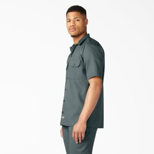 Our Men’s Short Sleeve Work Shirt has been one of our top styles since Dickies started in 1922. There’s a reason this style has stood the test of time. This original work shirt is crafted from our wrinkle-resistant classic twill fabric. with a generous cut through the shoulders and chest that provides freedom of movement. and square hem design for easy tucking. The piece features secure chest pockets with a pencil slot and non-break buttons. The shirt has a moisture-wicking finish to help keep you cool and dry all day long. Wear it buttoned up or over a simple tee.