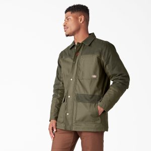 This Dickies Men’s Waxed Canvas Chore Coat has a classic design and a relaxed fit that’s perfect for the workplace. Made of strong cotton duck canvas. the wind-resistant jacket has a wax-coated fabric. with triple-needle reinforced stitching and a Durable Water Repellent finish. The chore coat has a full-zip closure and a snap-close storm flap. You can keep your items secure in the coat’s three exterior utility pockets and a back hem stash pocket.