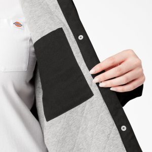 Discover the most versatile outer layer that delivers on the promise of warmth. durability and protection in Dickies Women’s Plus Hooded Duck Shirt Jacket. Combining the lived-in feel of a hoodie. the strength of a duck canvas work shirt and the security of a jacket. this workday essential will check the box for function and style. Featuring a sturdy brushed Duck canvas fabrication and equipped with a cozy jersey lining and hood. you’ll embrace the cold climate with ease in this shirt jacket. You’re covered in wet weather too. as the DWR finish ensures water repellency to keep you dry. Durable metal snap closures at front and a drop tail hem at rear offer even more protection when your work climate calls for it. Maximum utility comes standard with two large chest pockets and two side welt pockets to store all that you carry.