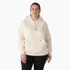Dickies’ Women’s Plus Water Repellent Sleeve Logo Hoodie is made of fleece. so it feels cozy and comfortable. Yet it’s as strong and durable as you. This plus size hoodie features the same design as our regular women’s hoodie. Double-needle stitching and the Durable Water Repellent (DWR) finish add strength and protection on wet days. The crossover neckline. three-piece adjustable hood. and rib-knit waist and cuffs add strength. durability. and comfort. even in rough weather conditions. Use the front kangaroo pockets to store small work essentials–or just to keep your hands warm. The Dickies Wordmark graphic logo adds style.